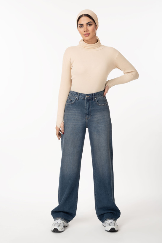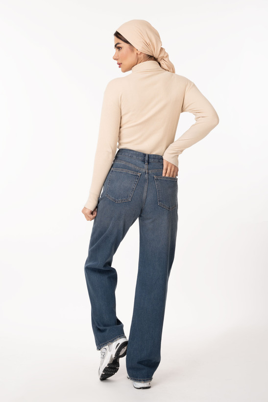 شلوار جین نیم بگ (Royal Jackpot) کمر ساده دمپا زاپ قد 110 آبی وسط برفکی